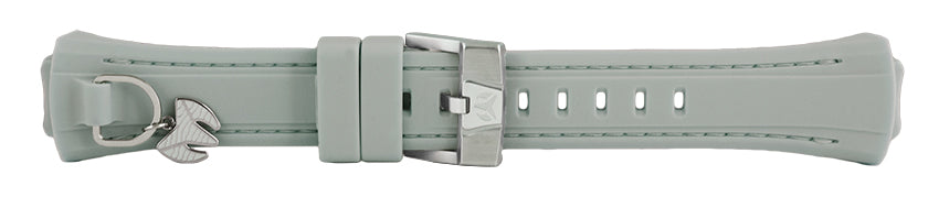 Band Material: Silicone, Band Tone: Grey with Grey Stitching White Back and Tassle, Band Size: 15 mm, Band Length: 173mm, Clasp Type: Buckle, Clasp Tone: Stainless Steel Please note that bands do not ship with spring bars or T bars. If you need these parts, please add them to your cart with the corresponding part sku.