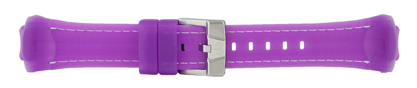 Band Material: Silicone, Band Tone: Purple with White Stitching and White Back, Band Size: 15 mm, Band Length: 173mm, Clasp Type: Buckle, Clasp Tone: Stainless Steel Please note that bands do not ship with spring bars or T bars. If you need these parts, please add them to your cart with the corresponding part sku.