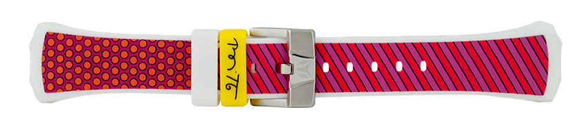 Band Material: Silicone, Band Tone: White with Red and Purple Stripes/Orange and Yellow Polka Dots, Band Size: 15 mm, Band Length: 175mm, Clasp Type: Buckle, Clasp Tone: Stainless Steel Please note that bands do not ship with spring bars or T bars. If you need these parts, please add them to your cart with the corresponding part sku.