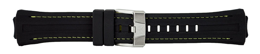 Band Material: Silicone, Band Tone: Black with Green Stitching and Green Back, Band Size: 17 mm, Band Length: 196mm, Clasp Type: Buckle, Clasp Tone: Stainless Steel Please note that bands do not ship with spring bars or T bars. If you need these parts, please add them to your cart with the corresponding part sku.