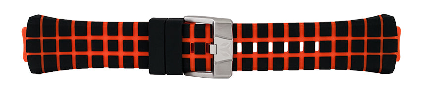 Band Material: Silicone, Band Tone: Black and Neon Orange Grid, Band Size: 17 mm, Band Length: 197mm, Clasp Type: Buckle, Clasp Tone: Stainless Steel Please note that bands do not ship with spring bars or T bars. If you need these parts, please add them to your cart with the corresponding part sku.
