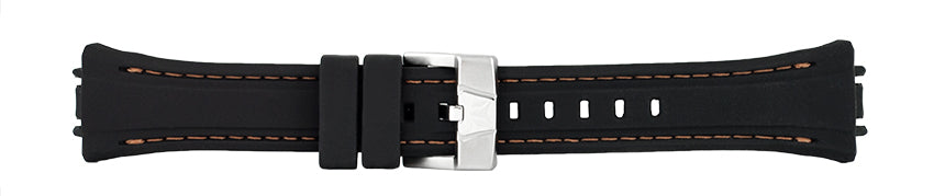 Band Material: Silicone, Band Tone: Black with Orange Stitching, Band Size: 15 mm, Band Length: 184mm, Clasp Type: Buckle, Clasp Tone: Stainless Steel Please note that bands do not ship with spring bars or T bars. If you need these parts, please add them to your cart with the corresponding part sku.