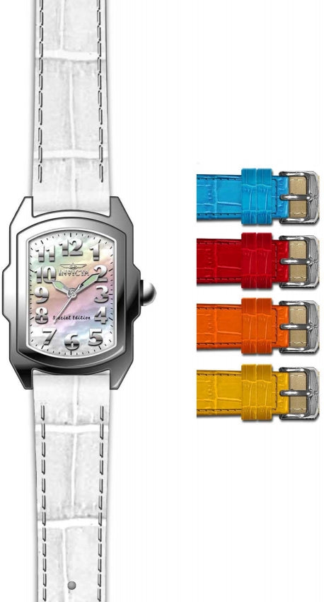Band For Lady Invicta Lupah 14946, Band Material Leather, Band Color White, Blue, Red, Orange, Yellow. Band Width 16 MM, Band Length 194 MM, Buckle Type Regular, Clasp Type Regular. Please note that bands do not ship with spring bars or T bars. If you need these parts, please add them to your cart with the corresponding part sku.