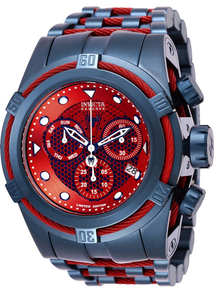 Band for Invicta Marvel 26012, Band Material: Stainless Steel, Band Tone: Dark Blue, Red, Band Size in mm: 35, Band length in mm: 210, Buckle Type: Diver, Clasp Type: Deployment, Safety. Please note that bands do not ship with spring bars or T bars. If you need these parts, please add them to your cart with the corresponding part sku.