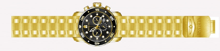Band for Invicta Pro Diver 0072, Band Material: Stainless Steel, Band Color: Gold, Band Width: 26mm, Band Length: 215mm, Buckle Type: Diver, Clasp Type: Foldover, Safety. Please note that bands do not ship with spring bars or T bars. If you need these parts, please add them to your cart with the corresponding part sku.