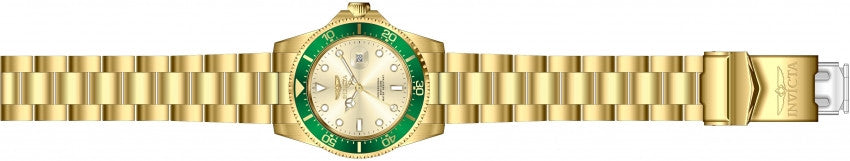 Band For Men Invicta Pro Diver 22067, Band Material Stainless Steel, Band Color Gold, Band Width 22 MM, Band Length 215 MM, Buckle Type Diver, Clasp Type Foldover, Safety. Please note that bands do not ship with spring bars or T bars. If you need these parts, please add them to your cart with the corresponding part sku.