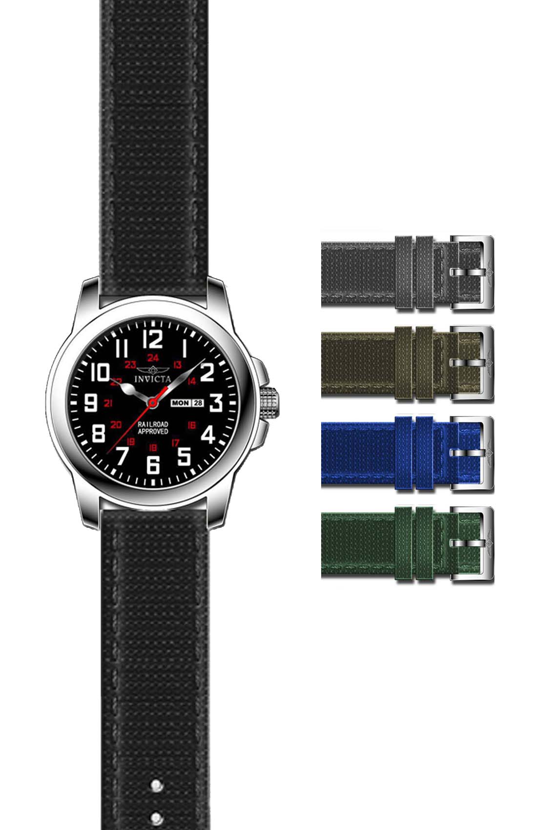 Bands For Men Invicta Specialty 1552, Band Material Nylon, Band Color Black, Grey, Olive Gree, Blue, Green. Band Width 22 MM, Band Length 226 MM, Buckle Type Regular, Clasp Type Regular. Please note that bands do not ship with spring bars or T bars. If you need these parts, please add them to your cart with the corresponding part sku.