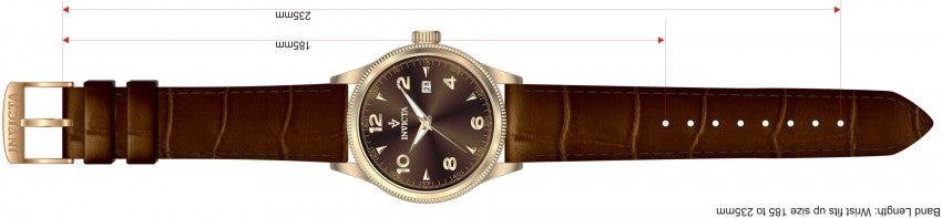 Band For Men Invicta Vintage 12199, Band Material Leather, Band Color Brown, Band Width 22 MM, Band Length 235 MM, Buckle Type Regular, Clasp Type Regular. Please note that bands do not ship with spring bars or T bars. If you need these parts, please add them to your cart with the corresponding part sku.