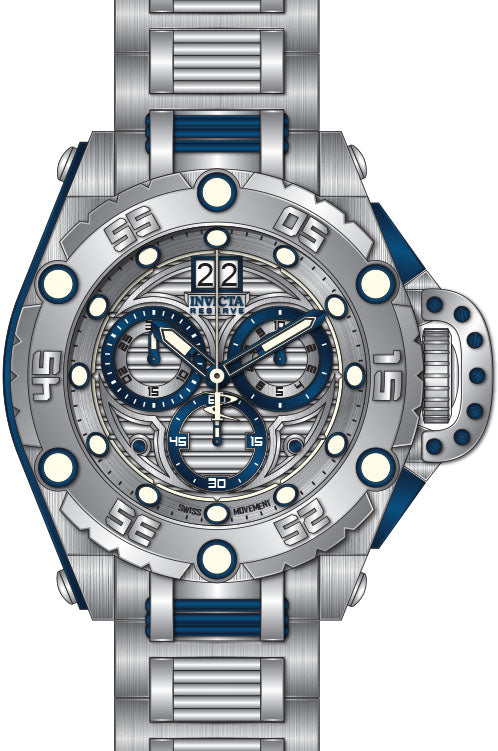 Band Material: Stainless Steel, Band Tone: Dark Blue, Steel, Band Width: 26.0MM, Band Length: 210MM, Crown Type: Screw Down, Case Material: Stainless Steel, Case Tone: Steel, Dark Blue, Case Size [mm]: 52.5, Color of Hands: Luminous, Blue, Crystal Type: Flame Fusion, Bezel Material: Stainless Steel, Dial Material: Metal, Dial Color: Silver, Blue .Purchasing these parts and having a non-authorized repair center open your watch voids all manufacturing warranties. Invicta cannot guarantee the quality standards of an altered timepiece, the standard 3-year limited warranty on Invicta timepieces shall be invalid if the timepiece is serviced at any time by an unauthorized repair center. This includes battery replacements, which must be done at an Invicta authorized repair center in order to maintain the eligibility of the warranty. Please follow the link below to learn more about Invicta's warranty.https://cdn.invictawatch.com/www/files/invicta-warranty-2018.pdf