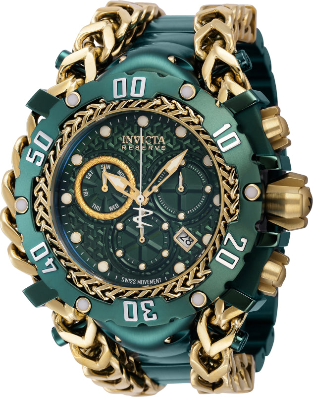 Band Material: Stainless Steel, Band Tone: Green, Gold, Band Width: 41MM, Band Length: 210MM, Crown Type: Screw Down, Case Material: Stainless Steel, Case Tone: Steel, Green, Gold, Case Size [mm]: 58.30, Color of Hands: Luminous, Gold, Crystal Type: Flame Fusion, Bezel Material: Stainless Steel, Dial Material: Metal, Dial Color: Green, Gold .Purchasing these parts and having a non-authorized repair center open your watch voids all manufacturing warranties. Invicta cannot guarantee the quality standards of an altered timepiece, the standard 3-year limited warranty on Invicta timepieces shall be invalid if the timepiece is serviced at any time by an unauthorized repair center. This includes battery replacements, which must be done at an Invicta authorized repair center in order to maintain the eligibility of the warranty. Please follow the link below to learn more about Invicta's warranty.https://cdn.invictawatch.com/www/files/invicta-warranty-2018.pdf