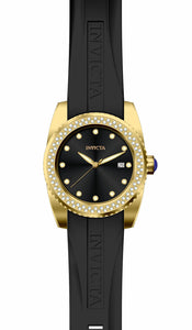 INVICTA Angel Lady 38mm Stainless Steel Gold Black dial PC32A Quartz , Band Material: Silicone, Band Tone: Black, Band Size [mm]: 20, Band Length [mm]: 190, Buckle Type: Buckle , Crown Type : Push, Case Material : Stainless Steel, Case Tone : Gold, Case Size (mm) : 38, Case Back : Solid, Material of Hands : Metal, Color of Hands : Gold,Luminous, Crystal Type : Mineral, Bezel Material : Stainless Steel, Dial Material : Metal, Dial Color : Black, Dial Pattern : Sun-ray Finish .Purchasing these parts and having a non-authorized repair center open your watch voids all manufacturing warranties. Invicta cannot guarantee the quality standards of an altered timepiece, the standard 3-year limited warranty on Invicta timepieces shall be invalid if the timepiece is serviced at any time by an unauthorized repair center. This includes battery replacements, which must be done at an Invicta authorized repair center in order to maintain the eligibility of the warranty. Please follow the link below to learn more about Invicta's warranty.https://cdn.invictawatch.com/www/files/invicta-warranty-2018.pdf