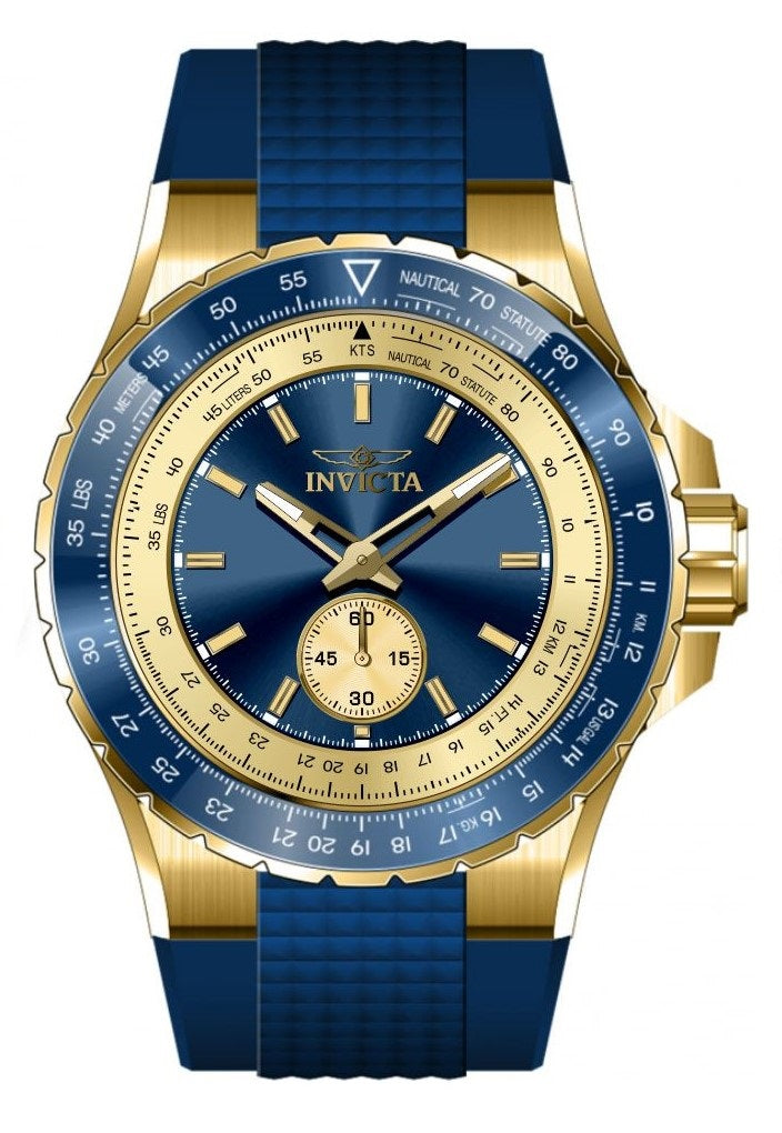 Band Material: Silicone, Band Tone: Blue, Band Width: 32.5MM, Band Length: 225MM, Crown Type: Push, Case Material: Stainless Steel, Case Tone: Gold, Case Size [mm]: 50, Case Back: Solid, Material of Hands: Brass, Color of Hands: Gold,Luminous, Crystal Type: Mineral, Bezel Material: Stainless Steel,Aluminum, Dial Material: Brass, Dial Color: Blue, Dial Pattern: Sun-ray Finish .Purchasing these parts and having a non-authorized repair center open your watch voids all manufacturing warranties. Invicta cannot guarantee the quality standards of an altered timepiece, the standard 3-year limited warranty on Invicta timepieces shall be invalid if the timepiece is serviced at any time by an unauthorized repair center. This includes battery replacements, which must be done at an Invicta authorized repair center in order to maintain the eligibility of the warranty. Please follow the link below to learn more about Invicta's warranty.https://cdn.invictawatch.com/www/files/invicta-warranty-2018.pdf