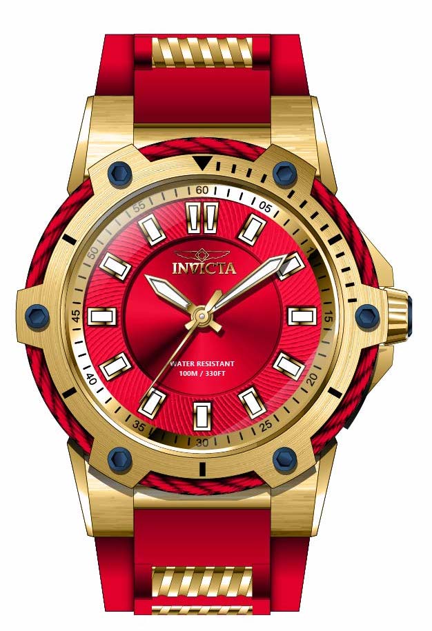 Band Material: Stainless Steel,Silicone, Band Tone: Gold,Red, Band Width: 22MM, Band Length: 193MM, Crown Type: Push, Case Material: Stainless Steel, Case Tone: Gold, Case Size [mm]: 38, Case Back: Solid, Material of Hands: Metal, Color of Hands: Silver,Red, Crystal Type: Flame Fusion, Bezel Material: Stainless Steel,Cable, Dial Material: Metal, Dial Color: Red, Dial Pattern: Sun-ray Finish .Purchasing these parts and having a non-authorized repair center open your watch voids all manufacturing warranties. Invicta cannot guarantee the quality standards of an altered timepiece, the standard 3-year limited warranty on Invicta timepieces shall be invalid if the timepiece is serviced at any time by an unauthorized repair center. This includes battery replacements, which must be done at an Invicta authorized repair center in order to maintain the eligibility of the warranty. Please follow the link below to learn more about Invicta's warranty.https://cdn.invictawatch.com/www/files/invicta-warranty-2018.pdf