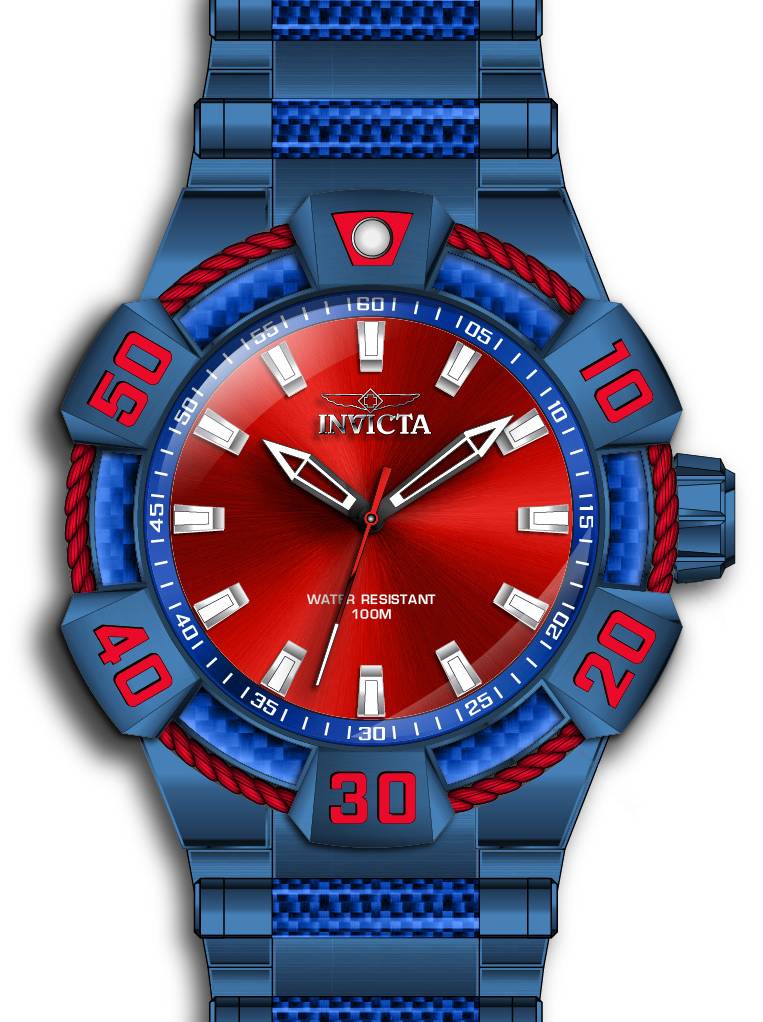 Band Material: Stainless Steel,Glass Fiber, Band Tone: Blue, Band Width: 32MM, Band Length: 190MM, Crown Type: Push, Case Material: Stainless Steel, Case Tone: Blue, Case Size [mm]: 52, Case Back: Exhibition, Material of Hands: Metal, Color of Hands: Black,Red, Crystal Type: Flame Fusion, Bezel Material: Stainless Steel,Glass Fiber,Cable, Dial Material: Metal, Dial Color: Red .Purchasing these parts and having a non-authorized repair center open your watch voids all manufacturing warranties. Invicta cannot guarantee the quality standards of an altered timepiece, the standard 3-year limited warranty on Invicta timepieces shall be invalid if the timepiece is serviced at any time by an unauthorized repair center. This includes battery replacements, which must be done at an Invicta authorized repair center in order to maintain the eligibility of the warranty. Please follow the link below to learn more about Invicta's warranty.https://cdn.invictawatch.com/www/files/invicta-warranty-2018.pdf