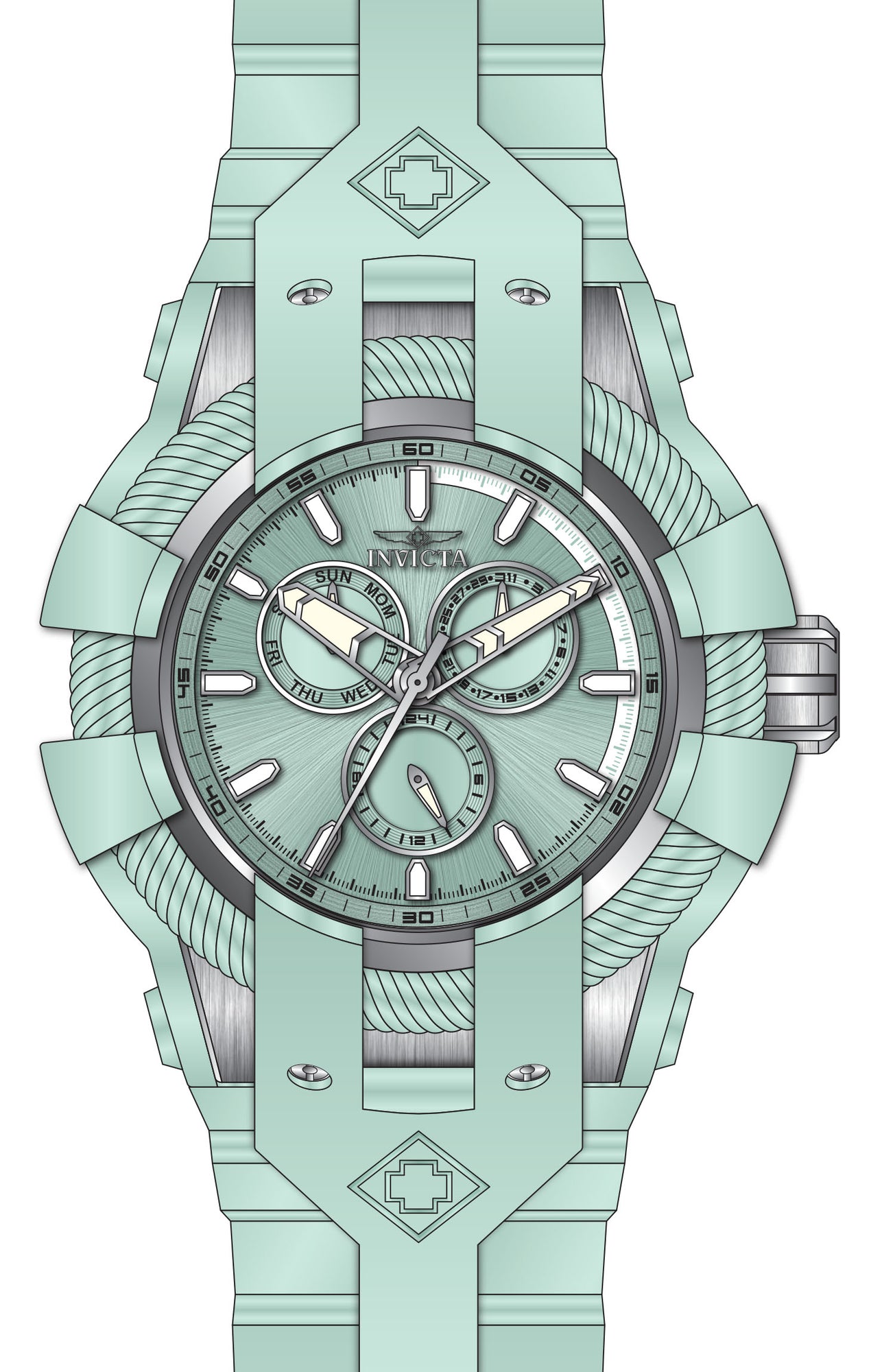 Band Material: Silicone, Band Tone: Turquoise, Band Width: 32MM, Band Length: 210MM, Crown Type: Push, Case Material: Stainless Steel,Silicone, Case Tone: Steel,Turquoise, Case Size [mm]: 50, Case Back: Solid screwed, Material of Hands: Metal, Color of Hands: Silver,Luminous, Crystal Type: Mineral, Bezel Material: Stainless Steel, Dial Material: Metal, Dial Color: Turquoise, Dial Pattern: Sun-ray Finish .Purchasing these parts and having a non-authorized repair center open your watch voids all manufacturing warranties. Invicta cannot guarantee the quality standards of an altered timepiece, the standard 3-year limited warranty on Invicta timepieces shall be invalid if the timepiece is serviced at any time by an unauthorized repair center. This includes battery replacements, which must be done at an Invicta authorized repair center in order to maintain the eligibility of the warranty. Please follow the link below to learn more about Invicta's warranty.https://cdn.invictawatch.com/www/files/invicta-warranty-2018.pdf