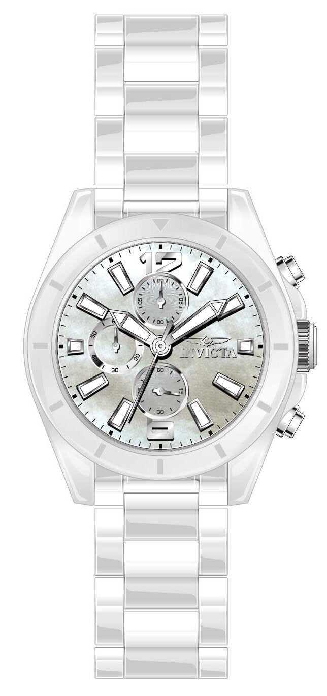 Band Material: Ceramic, Band Tone: White, Band Width: 22MM, Band Length: 183MM, Crown Type: Push, Case Material: Ceramic, Case Tone: White, Case Size [mm]: 44.5, Crystal Type: Flame Fusion, Dial Material: Mother of Pearl, Dial Color: Silver .Purchasing these parts and having a non-authorized repair center open your watch voids all manufacturing warranties. Invicta cannot guarantee the quality standards of an altered timepiece, the standard 3-year limited warranty on Invicta timepieces shall be invalid if the timepiece is serviced at any time by an unauthorized repair center. This includes battery replacements, which must be done at an Invicta authorized repair center in order to maintain the eligibility of the warranty. Please follow the link below to learn more about Invicta's warranty.https://cdn.invictawatch.com/www/files/invicta-warranty-2018.pdf
