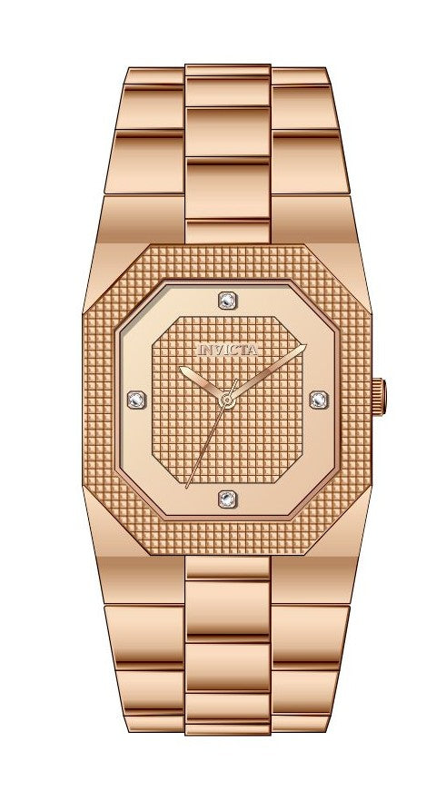 Band Material: Stainless Steel, Band Tone: Rose Gold, Band Width: 23MM, Band Length: 175MM, Crown Type: Push, Case Material: Stainless Steel, Case Tone: Rose Gold, Case Size [mm]: 27, Case Back: Solid, Material of Hands: Brass, Color of Hands: Rose Gold, Crystal Type: Mineral, Bezel Material: None, Dial Material: Brass, Dial Color: Rose Gold, Dial Pattern: Embossed pattern .Purchasing these parts and having a non-authorized repair center open your watch voids all manufacturing warranties. Invicta cannot guarantee the quality standards of an altered timepiece, the standard 3-year limited warranty on Invicta timepieces shall be invalid if the timepiece is serviced at any time by an unauthorized repair center. This includes battery replacements, which must be done at an Invicta authorized repair center in order to maintain the eligibility of the warranty. Please follow the link below to learn more about Invicta's warranty.https://cdn.invictawatch.com/www/files/invicta-warranty-2018.pdf