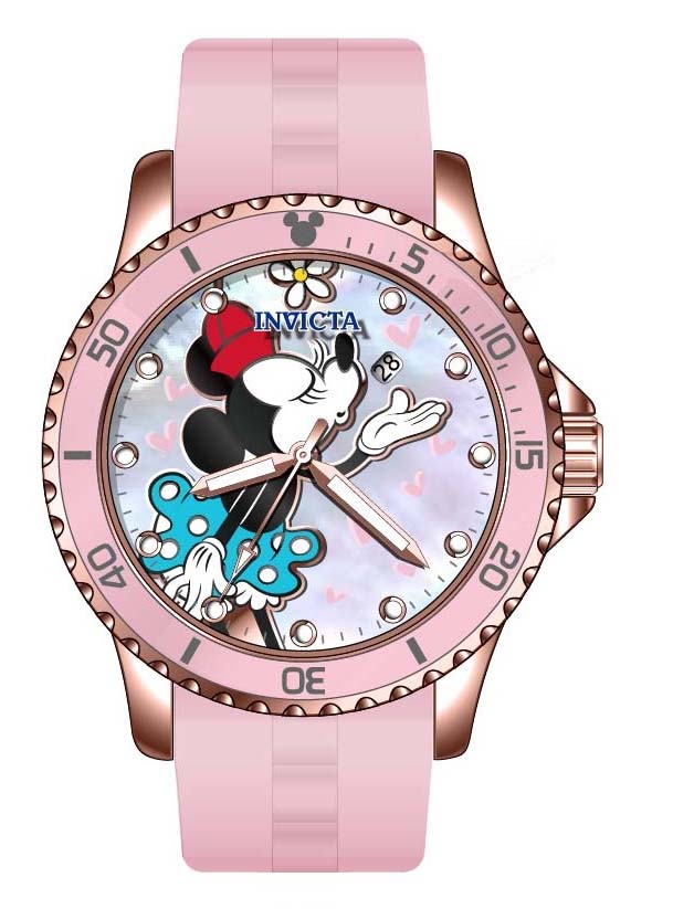 INVICTA Disney Limited Edition Lady 40mm Stainless Steel Rose Gold White dial PC32 Quartz , Band Material: Silicone, Band Tone: Pink, Band Size [mm]: 20, Band Length [mm]: 210, Buckle Type: Buckle , Crown Type : Push, Case Material : Stainless Steel, Case Tone : Rose Gold, Case Size (mm) : 40, Case Back : Solid, Material of Hands : Metal, Color of Hands : Rose Gold, Crystal Type : Flame Fusion, Bezel Material : Stainless Steel,Aluminum, Dial Material : Metal,Mother of Pearl, Dial Color : White .Purchasing these parts and having a non-authorized repair center open your watch voids all manufacturing warranties. Invicta cannot guarantee the quality standards of an altered timepiece, the standard 3-year limited warranty on Invicta timepieces shall be invalid if the timepiece is serviced at any time by an unauthorized repair center. This includes battery replacements, which must be done at an Invicta authorized repair center in order to maintain the eligibility of the warranty. Please follow the link below to learn more about Invicta's warranty.https://cdn.invictawatch.com/www/files/invicta-warranty-2018.pdf
