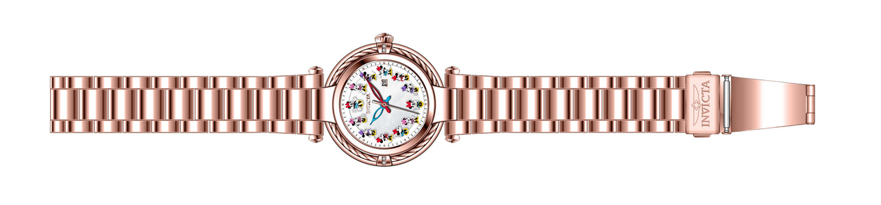 INVICTA Disney Limited Edition Lady 40mm Stainless Steel Rose Gold White dial PC22A Quartz , Band Material: Stainless Steel, Band Tone: Rose Gold, Band Size [mm]: 20, Band Length [mm]: 175, Buckle Type: Fold over push button , Crown Type : Push, Case Material : Stainless Steel, Case Tone : Rose Gold, Case Size (mm) : 40, Case Back : Solid, Material of Hands : Metal, Color of Hands : Blue,Red,Rose Gold, Crystal Type : Flame Fusion, Bezel Material : Stainless Steel,Cable, Dial Material : Mother of Pearl, Dial Color : White .Purchasing these parts and having a non-authorized repair center open your watch voids all manufacturing warranties. Invicta cannot guarantee the quality standards of an altered timepiece, the standard 3-year limited warranty on Invicta timepieces shall be invalid if the timepiece is serviced at any time by an unauthorized repair center. This includes battery replacements, which must be done at an Invicta authorized repair center in order to maintain the eligibility of the warranty. Please follow the link below to learn more about Invicta's warranty.https://cdn.invictawatch.com/www/files/invicta-warranty-2018.pdf