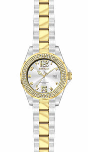 INVICTA Pro Diver Lady 38mm Stainless Steel Gold + Steel Silver dial PC32A Quartz , Band Material: Stainless Steel, Band Tone: Steel,Gold, Band Size [mm]: 18, Band Length [mm]: 195, Buckle Type: Fold over safety , Crown Type : Push, Case Material : Stainless Steel, Case Tone : Gold,Steel, Case Size (mm) : 38, Case Back : Solid, Material of Hands : Metal, Color of Hands : Gold,Luminous, Crystal Type : Mineral, Bezel Material : Stainless Steel, Dial Material : Metal, Dial Color : Silver, Dial Pattern : Sun-ray Finish .Purchasing these parts and having a non-authorized repair center open your watch voids all manufacturing warranties. Invicta cannot guarantee the quality standards of an altered timepiece, the standard 3-year limited warranty on Invicta timepieces shall be invalid if the timepiece is serviced at any time by an unauthorized repair center. This includes battery replacements, which must be done at an Invicta authorized repair center in order to maintain the eligibility of the warranty. Please follow the link below to learn more about Invicta's warranty.https://cdn.invictawatch.com/www/files/invicta-warranty-2018.pdf