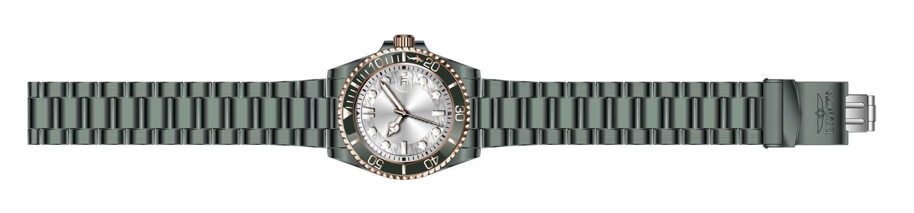 INVICTA Pro Diver Lady 38mm Stainless Steel Green Silver dial PC32 Quartz , Band Material: Stainless Steel, Band Tone: Green, Band Size [mm]: 20, Band Length [mm]: 175, Buckle Type: Fold over safety , Crown Type : Push, Case Material : Stainless Steel, Case Tone : Green, Case Size (mm) : 38, Case Back : Solid, Material of Hands : Metal, Color of Hands : White,Gold, Crystal Type : Flame Fusion, Bezel Material : Stainless Steel, Dial Material : Metal, Dial Color : Silver, Dial Pattern : Sun-ray Finish .Purchasing these parts and having a non-authorized repair center open your watch voids all manufacturing warranties. Invicta cannot guarantee the quality standards of an altered timepiece, the standard 3-year limited warranty on Invicta timepieces shall be invalid if the timepiece is serviced at any time by an unauthorized repair center. This includes battery replacements, which must be done at an Invicta authorized repair center in order to maintain the eligibility of the warranty. Please follow the link below to learn more about Invicta's warranty.https://cdn.invictawatch.com/www/files/invicta-warranty-2018.pdf