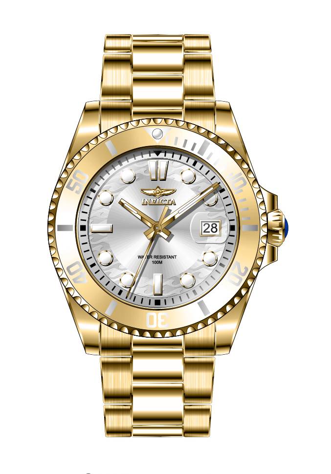 Band Material: Stainless Steel, Band Tone: Gold, Band Width: 20MM, Band Length: 179.5MM, Crown Type: Push, Case Material: Stainless Steel, Case Tone: Gold, Case Size [mm]: 38, Case Back: Solid, Material of Hands: Metal, Color of Hands: Gold, Crystal Type: Flame Fusion, Bezel Material: Stainless Steel,Aluminum, Dial Material: Metal, Dial Color: Silver, Dial Pattern: Sun-ray Finish .Purchasing these parts and having a non-authorized repair center open your watch voids all manufacturing warranties. Invicta cannot guarantee the quality standards of an altered timepiece, the standard 3-year limited warranty on Invicta timepieces shall be invalid if the timepiece is serviced at any time by an unauthorized repair center. This includes battery replacements, which must be done at an Invicta authorized repair center in order to maintain the eligibility of the warranty. Please follow the link below to learn more about Invicta's warranty.https://cdn.invictawatch.com/www/files/invicta-warranty-2018.pdf