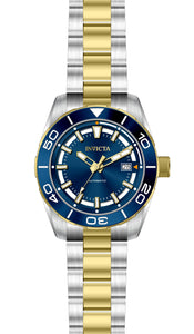 INVICTA Pro Diver Men 45mm Stainless Steel Gold + Blue + Steel Blue dial NH35A Automatic , Band Material: Stainless Steel, Band Tone: Steel,Gold, Band Size [mm]: 22, Band Length [mm]: 210, Buckle Type: Fold over safety , Crown Type : Push, Case Material : Stainless Steel, Case Tone : Gold,Blue,Steel, Case Size (mm) : 45, Case Back : Exhibition, Material of Hands : Metal, Color of Hands : Gold,Luminous, Crystal Type : Flame Fusion, Bezel Material : Stainless Steel, Dial Material : Metal, Dial Color : Blue, Dial Pattern : Sun-ray Finish .Purchasing these parts and having a non-authorized repair center open your watch voids all manufacturing warranties. Invicta cannot guarantee the quality standards of an altered timepiece, the standard 3-year limited warranty on Invicta timepieces shall be invalid if the timepiece is serviced at any time by an unauthorized repair center. This includes battery replacements, which must be done at an Invicta authorized repair center in order to maintain the eligibility of the warranty. Please follow the link below to learn more about Invicta's warranty.https://cdn.invictawatch.com/www/files/invicta-warranty-2018.pdf