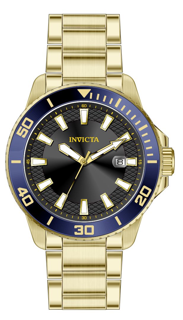 Band Material: Stainless Steel, Band Tone: Gold, Band Width: 22MM, Band Length: 191MM, Crown Type: Push, Case Material: Stainless Steel, Case Tone: Gold, Case Size [mm]: 45, Crystal Type: Flame Fusion, Dial Material: Brass, Dial Color: Black .Purchasing these parts and having a non-authorized repair center open your watch voids all manufacturing warranties. Invicta cannot guarantee the quality standards of an altered timepiece, the standard 3-year limited warranty on Invicta timepieces shall be invalid if the timepiece is serviced at any time by an unauthorized repair center. This includes battery replacements, which must be done at an Invicta authorized repair center in order to maintain the eligibility of the warranty. Please follow the link below to learn more about Invicta's warranty.https://cdn.invictawatch.com/www/files/invicta-warranty-2018.pdf