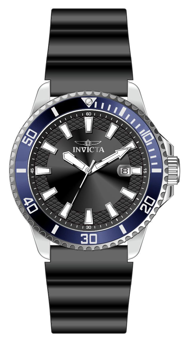 Band Material: Silicone, Band Tone: Black, Band Width: 22MM, Band Length: 225MM, Crown Type: Push, Case Material: Stainless Steel, Case Tone: Steel, Case Size [mm]: 45, Crystal Type: Flame Fusion, Dial Material: Brass, Dial Color: Black .Purchasing these parts and having a non-authorized repair center open your watch voids all manufacturing warranties. Invicta cannot guarantee the quality standards of an altered timepiece, the standard 3-year limited warranty on Invicta timepieces shall be invalid if the timepiece is serviced at any time by an unauthorized repair center. This includes battery replacements, which must be done at an Invicta authorized repair center in order to maintain the eligibility of the warranty. Please follow the link below to learn more about Invicta's warranty.https://cdn.invictawatch.com/www/files/invicta-warranty-2018.pdf