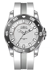 Band Material: Silicone, Band Tone: White, Band Width: 26MM, Band Length: 210MM, Crown Type: Push, Case Material: Stainless Steel, Case Tone: Steel, Case Size [mm]: 50, Case Back: Solid, Material of Hands: Metal, Color of Hands: Silver, Crystal Type: Flame Fusion, Bezel Material: Stainless Steel,Aluminum, Dial Material: Metal, Dial Color: Silver, Dial Pattern: Textured Pattern .Purchasing these parts and having a non-authorized repair center open your watch voids all manufacturing warranties. Invicta cannot guarantee the quality standards of an altered timepiece, the standard 3-year limited warranty on Invicta timepieces shall be invalid if the timepiece is serviced at any time by an unauthorized repair center. This includes battery replacements, which must be done at an Invicta authorized repair center in order to maintain the eligibility of the warranty. Please follow the link below to learn more about Invicta's warranty.https://cdn.invictawatch.com/www/files/invicta-warranty-2018.pdf