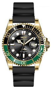 Band Material: Silicone, Band Tone: Black, Band Width: 22MM, Band Length: 210MM, Crown Type: Screw Down, Case Material: Stainless Steel, Case Tone: Gold, Case Size [mm]: 43, Case Back: Solid, Material of Hands: Metal, Color of Hands: Gold, Crystal Type: Flame Fusion, Bezel Material: Stainless Steel,Aluminum, Dial Material: Metal, Dial Color: Black .Purchasing these parts and having a non-authorized repair center open your watch voids all manufacturing warranties. Invicta cannot guarantee the quality standards of an altered timepiece, the standard 3-year limited warranty on Invicta timepieces shall be invalid if the timepiece is serviced at any time by an unauthorized repair center. This includes battery replacements, which must be done at an Invicta authorized repair center in order to maintain the eligibility of the warranty. Please follow the link below to learn more about Invicta's warranty.https://cdn.invictawatch.com/www/files/invicta-warranty-2018.pdf