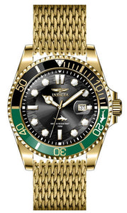 Band Material: Mesh, Band Tone: Gold, Band Width: 22MM, Band Length: 210MM, Crown Type: Screw Down, Case Material: Stainless Steel, Case Tone: Gold, Case Size [mm]: 43, Case Back: Solid, Material of Hands: Metal, Color of Hands: Gold, Crystal Type: Flame Fusion, Bezel Material: Stainless Steel,Aluminum, Dial Material: Metal, Dial Color: Black .Purchasing these parts and having a non-authorized repair center open your watch voids all manufacturing warranties. Invicta cannot guarantee the quality standards of an altered timepiece, the standard 3-year limited warranty on Invicta timepieces shall be invalid if the timepiece is serviced at any time by an unauthorized repair center. This includes battery replacements, which must be done at an Invicta authorized repair center in order to maintain the eligibility of the warranty. Please follow the link below to learn more about Invicta's warranty.https://cdn.invictawatch.com/www/files/invicta-warranty-2018.pdf