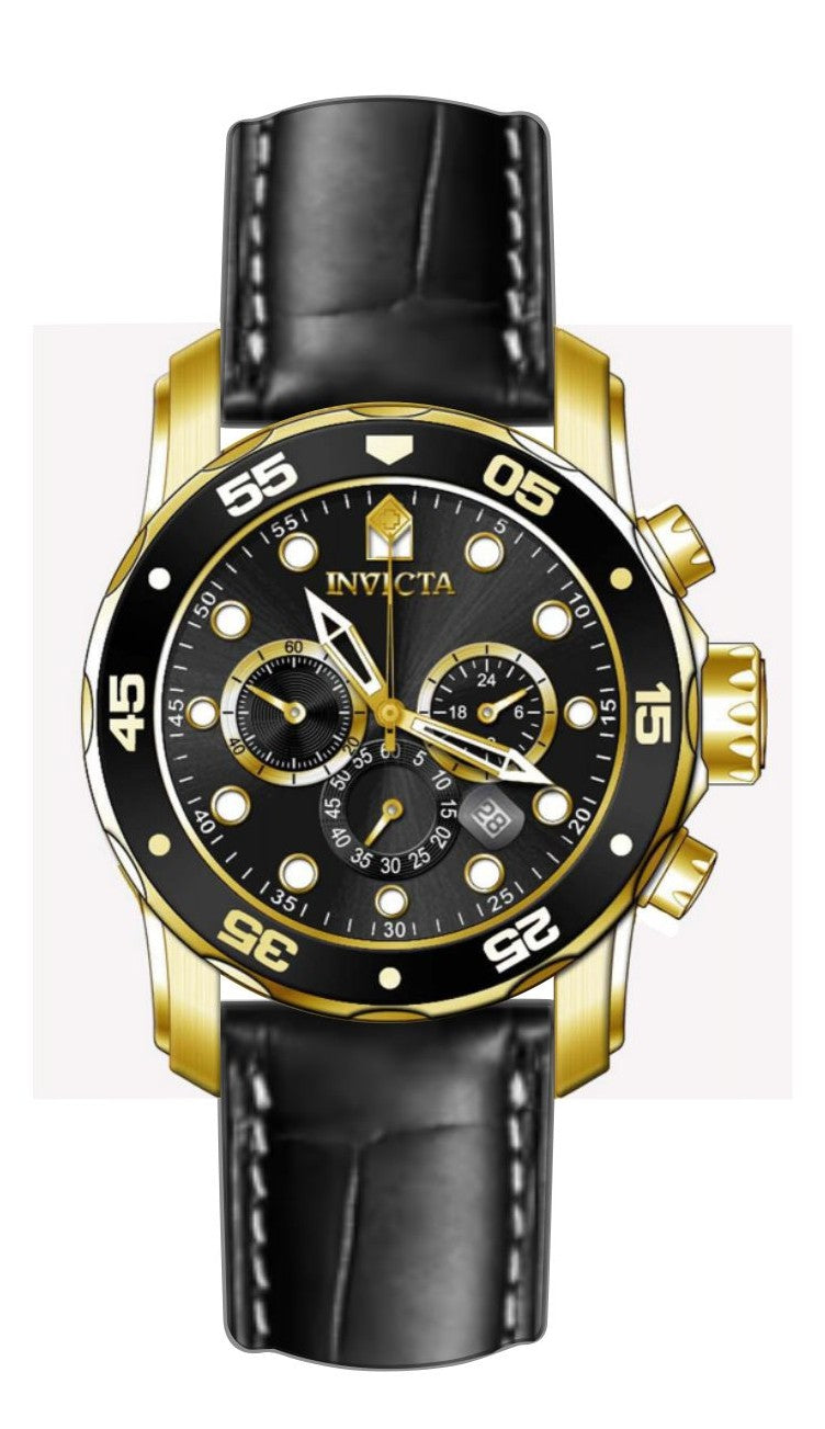 Band Material: Leather, Band Tone: Black, Band Width: 26MM, Band Length: 215MM, Crown Type: Push, Case Material: Stainless Steel, Case Tone: Gold, Case Size [mm]: 48, Case Back: Solid, Material of Hands: Brass, Color of Hands: Gold,Luminous, Crystal Type: Mineral, Bezel Material: Stainless Steel,Aluminum, Dial Material: Brass, Dial Color: Black, Dial Pattern: Sun-ray Finish .Purchasing these parts and having a non-authorized repair center open your watch voids all manufacturing warranties. Invicta cannot guarantee the quality standards of an altered timepiece, the standard 3-year limited warranty on Invicta timepieces shall be invalid if the timepiece is serviced at any time by an unauthorized repair center. This includes battery replacements, which must be done at an Invicta authorized repair center in order to maintain the eligibility of the warranty. Please follow the link below to learn more about Invicta's warranty.https://cdn.invictawatch.com/www/files/invicta-warranty-2018.pdf
