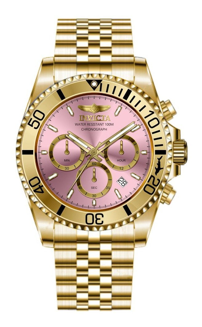Band Material: Stainless Steel, Band Tone: Gold, Band Width: 22MM, Band Length: 195MM, Crown Type: Screw Down, Case Material: Stainless Steel, Case Tone: Gold, Case Size [mm]: 43, Case Back: Solid, Material of Hands: Brass, Color of Hands: Gold,Luminous, Crystal Type: Flame Fusion, Bezel Material: Stainless Steel,Aluminum, Dial Material: Brass, Dial Color: Pink, Dial Pattern: Sun-ray Finish .Purchasing these parts and having a non-authorized repair center open your watch voids all manufacturing warranties. Invicta cannot guarantee the quality standards of an altered timepiece, the standard 3-year limited warranty on Invicta timepieces shall be invalid if the timepiece is serviced at any time by an unauthorized repair center. This includes battery replacements, which must be done at an Invicta authorized repair center in order to maintain the eligibility of the warranty. Please follow the link below to learn more about Invicta's warranty.https://cdn.invictawatch.com/www/files/invicta-warranty-2018.pdf