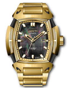 Band Material: Stainless Steel, Band Tone: Gold, Band Width: 31MM, Band Length: 220MM, Crown Type: Push, Case Material: Stainless Steel,Aluminum, Case Tone: Gold,Black, Case Size [mm]: 53, Case Back: Exhibition, Material of Hands: Metal, Color of Hands: Gold, Crystal Type: Flame Fusion, Bezel Material: Stainless Steel, Dial Material: Mother of Pearl, Dial Color: Black, Dial Pattern: None .Purchasing these parts and having a non-authorized repair center open your watch voids all manufacturing warranties. Invicta cannot guarantee the quality standards of an altered timepiece, the standard 3-year limited warranty on Invicta timepieces shall be invalid if the timepiece is serviced at any time by an unauthorized repair center. This includes battery replacements, which must be done at an Invicta authorized repair center in order to maintain the eligibility of the warranty. Please follow the link below to learn more about Invicta's warranty.https://cdn.invictawatch.com/www/files/invicta-warranty-2018.pdf