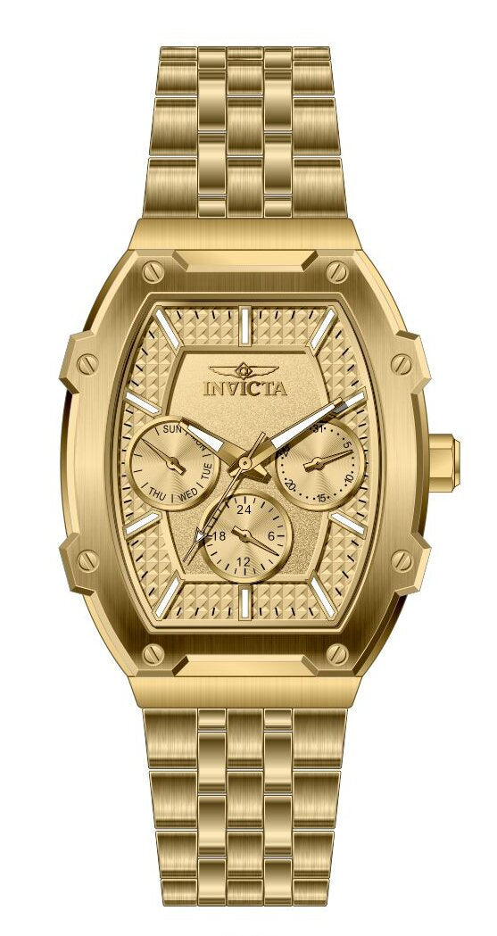 Band Material: Stainless Steel, Band Tone: Gold, Band Width: 20MM, Band Length: 185MM, Crown Type: Push, Case Material: Stainless Steel, Case Tone: Gold, Case Size [mm]: 35, Case Back: Solid, Material of Hands: Brass, Color of Hands: Gold,Luminous, Crystal Type: Mineral, Bezel Material: None, Dial Material: Brass, Dial Color: Gold, Dial Pattern: Embossed pattern .Purchasing these parts and having a non-authorized repair center open your watch voids all manufacturing warranties. Invicta cannot guarantee the quality standards of an altered timepiece, the standard 3-year limited warranty on Invicta timepieces shall be invalid if the timepiece is serviced at any time by an unauthorized repair center. This includes battery replacements, which must be done at an Invicta authorized repair center in order to maintain the eligibility of the warranty. Please follow the link below to learn more about Invicta's warranty.https://cdn.invictawatch.com/www/files/invicta-warranty-2018.pdf