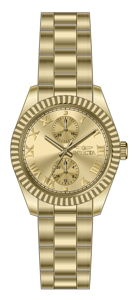Band Material: Stainless Steel, Band Tone: Gold, Band Width: 18MM, Band Length: 166MM, Crown Type: Push, Case Material: Stainless Steel, Case Tone: Gold, Case Size [mm]: 36, Crystal Type: Mineral, Dial Material: Brass, Dial Color: Gold .Purchasing these parts and having a non-authorized repair center open your watch voids all manufacturing warranties. Invicta cannot guarantee the quality standards of an altered timepiece, the standard 3-year limited warranty on Invicta timepieces shall be invalid if the timepiece is serviced at any time by an unauthorized repair center. This includes battery replacements, which must be done at an Invicta authorized repair center in order to maintain the eligibility of the warranty. Please follow the link below to learn more about Invicta's warranty.https://cdn.invictawatch.com/www/files/invicta-warranty-2018.pdf
