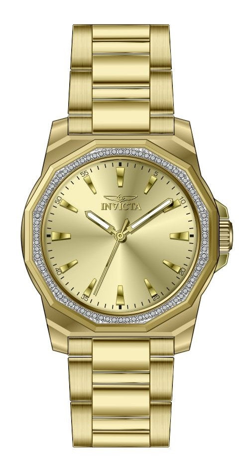 Band Material: Stainless Steel, Band Tone: Gold, Band Width: 18MM, Band Length: 170MM, Crown Type: Push, Case Material: Stainless Steel, Case Tone: Gold, Case Size [mm]: 34, Case Back: Solid, Material of Hands: Brass, Color of Hands: Gold,Luminous, Crystal Type: Mineral, Bezel Material: Crystal, Dial Material: Brass, Dial Color: Gold, Dial Pattern: Sun-ray Finish .Purchasing these parts and having a non-authorized repair center open your watch voids all manufacturing warranties. Invicta cannot guarantee the quality standards of an altered timepiece, the standard 3-year limited warranty on Invicta timepieces shall be invalid if the timepiece is serviced at any time by an unauthorized repair center. This includes battery replacements, which must be done at an Invicta authorized repair center in order to maintain the eligibility of the warranty. Please follow the link below to learn more about Invicta's warranty.https://cdn.invictawatch.com/www/files/invicta-warranty-2018.pdf