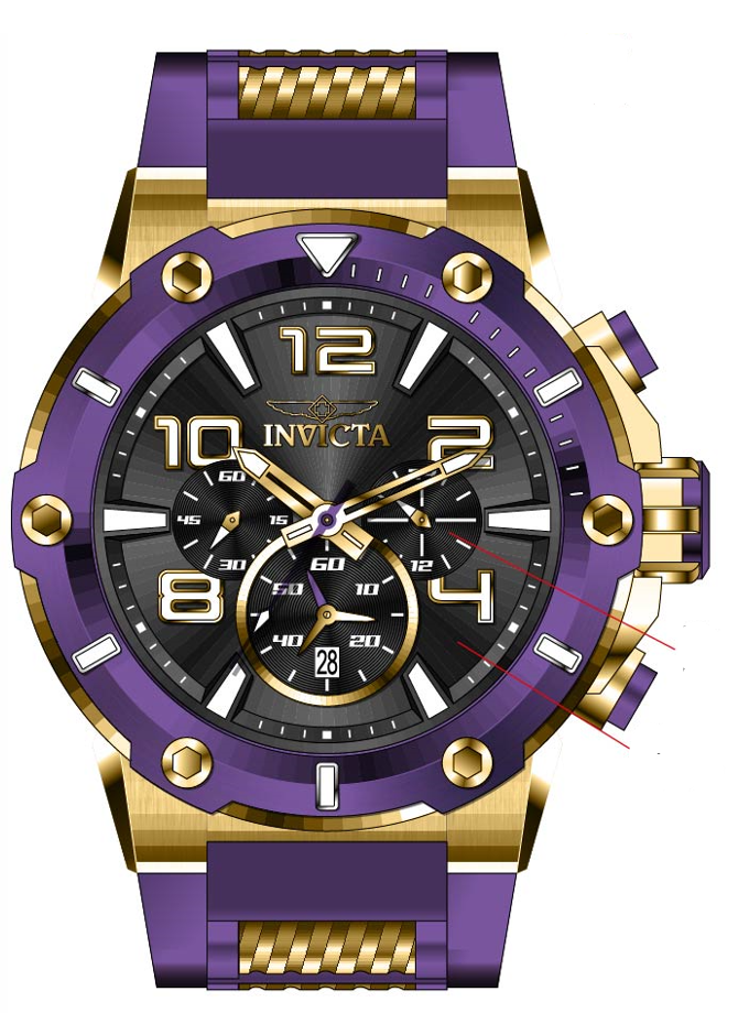 INVICTA Speedway Men 51.5mm Stainless Steel Gold Purple dial VD53 Quartz , Band Material: Stainless Steel,Silicone, Band Tone: Gold,Purple, Band Size [mm]: 30, Band Length [mm]: 210, Buckle Type: Buckle , Crown Type : Push, Case Material : Stainless Steel, Case Tone : Gold, Case Size (mm) : 51.5, Case Back : Solid, Material of Hands : Metal, Color of Hands : White,Gold, Crystal Type : Flame Fusion, Bezel Material : Stainless Steel, Dial Material : Metal, Dial Color : Purple, Dial Pattern : Sun-ray Finish .Purchasing these parts and having a non-authorized repair center open your watch voids all manufacturing warranties. Invicta cannot guarantee the quality standards of an altered timepiece, the standard 3-year limited warranty on Invicta timepieces shall be invalid if the timepiece is serviced at any time by an unauthorized repair center. This includes battery replacements, which must be done at an Invicta authorized repair center in order to maintain the eligibility of the warranty. Please follow the link below to learn more about Invicta's warranty.https://cdn.invictawatch.com/www/files/invicta-warranty-2018.pdf