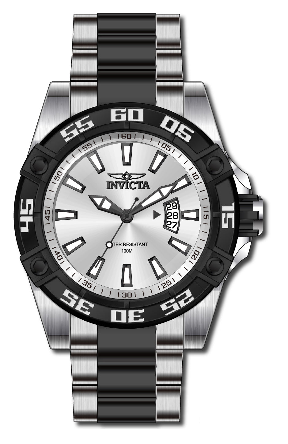 Band Material: Stainless Steel, Band Tone: Steel,Black, Band Width: 26MM, Band Length: 201MM, Crown Type: Push, Case Material: Stainless Steel, Case Tone: Steel, Case Size [mm]: 52, Case Back: Exhibition, Material of Hands: Metal, Color of Hands: Black, Crystal Type: Flame Fusion, Bezel Material: Stainless Steel,Aluminum, Dial Material: Metal, Dial Color: Silver, Dial Pattern: None .Purchasing these parts and having a non-authorized repair center open your watch voids all manufacturing warranties. Invicta cannot guarantee the quality standards of an altered timepiece, the standard 3-year limited warranty on Invicta timepieces shall be invalid if the timepiece is serviced at any time by an unauthorized repair center. This includes battery replacements, which must be done at an Invicta authorized repair center in order to maintain the eligibility of the warranty. Please follow the link below to learn more about Invicta's warranty.https://cdn.invictawatch.com/www/files/invicta-warranty-2018.pdf