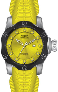 Band Material: Silicone, Band Tone: Yellow, Band Width: 26MM, Band Length: 210MM, Crown Type: Screw Down, Case Material: Stainless Steel, Case Tone: Steel, Case Size [mm]: 53.7, Case Back: Exhibition, Material of Hands: Metal, Color of Hands: Yellow,Luminous, Crystal Type: Mineral, Bezel Material: Stainless Steel, Dial Material: Metal, Dial Color: Yellow, Dial Pattern: Sun-ray Finish .Purchasing these parts and having a non-authorized repair center open your watch voids all manufacturing warranties. Invicta cannot guarantee the quality standards of an altered timepiece, the standard 3-year limited warranty on Invicta timepieces shall be invalid if the timepiece is serviced at any time by an unauthorized repair center. This includes battery replacements, which must be done at an Invicta authorized repair center in order to maintain the eligibility of the warranty. Please follow the link below to learn more about Invicta's warranty.https://cdn.invictawatch.com/www/files/invicta-warranty-2018.pdf