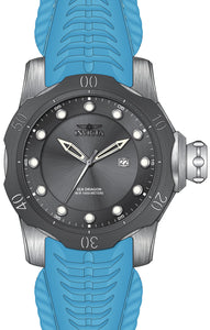Band Material: Silicone, Band Tone: Light Blue, Band Width: 26MM, Band Length: 210MM, Crown Type: Screw Down, Case Material: Stainless Steel, Case Tone: Gunmetal,Steel, Case Size [mm]: 53.7, Case Back: Exhibition, Material of Hands: Metal, Color of Hands: Luminous,Gunmetal, Crystal Type: Mineral, Bezel Material: Stainless Steel, Dial Material: Metal, Dial Color: Gunmetal, Dial Pattern: Sun-ray Finish .Purchasing these parts and having a non-authorized repair center open your watch voids all manufacturing warranties. Invicta cannot guarantee the quality standards of an altered timepiece, the standard 3-year limited warranty on Invicta timepieces shall be invalid if the timepiece is serviced at any time by an unauthorized repair center. This includes battery replacements, which must be done at an Invicta authorized repair center in order to maintain the eligibility of the warranty. Please follow the link below to learn more about Invicta's warranty.https://cdn.invictawatch.com/www/files/invicta-warranty-2018.pdf