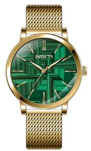 Band Material: Mesh, Band Tone: Gold, Band Width: 20MM, Band Length: 210MM, Crown Type: Push, Case Material: Stainless Steel, Case Tone: Gold, Case Size [mm]: 43, Case Back: Solid, Material of Hands: Metal, Color of Hands: Gold, Crystal Type: Flame Fusion, Bezel Material: Stainless Steel, Dial Material: Metal, Dial Color: Green .Purchasing these parts and having a non-authorized repair center open your watch voids all manufacturing warranties. Invicta cannot guarantee the quality standards of an altered timepiece, the standard 3-year limited warranty on Invicta timepieces shall be invalid if the timepiece is serviced at any time by an unauthorized repair center. This includes battery replacements, which must be done at an Invicta authorized repair center in order to maintain the eligibility of the warranty. Please follow the link below to learn more about Invicta's warranty.https://cdn.invictawatch.com/www/files/invicta-warranty-2018.pdf