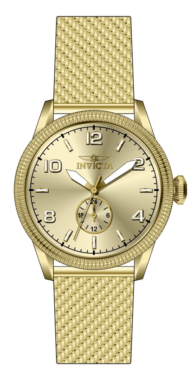 Band Material: Stainless Steel, Band Tone: Gold, Band Width: 22MM, Band Length: 205MM, Crown Type: Push, Case Material: Stainless Steel, Case Tone: Gold, Case Size [mm]: 44, Crystal Type: Flame Fusion, Dial Material: Brass, Dial Color: Gold .Purchasing these parts and having a non-authorized repair center open your watch voids all manufacturing warranties. Invicta cannot guarantee the quality standards of an altered timepiece, the standard 3-year limited warranty on Invicta timepieces shall be invalid if the timepiece is serviced at any time by an unauthorized repair center. This includes battery replacements, which must be done at an Invicta authorized repair center in order to maintain the eligibility of the warranty. Please follow the link below to learn more about Invicta's warranty.https://cdn.invictawatch.com/www/files/invicta-warranty-2018.pdf