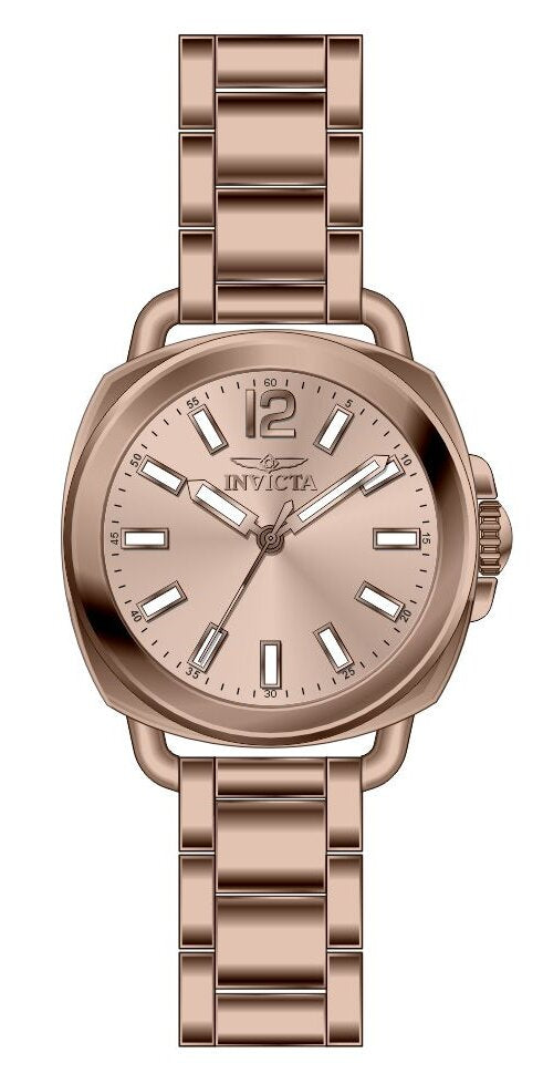 Band Material: Stainless Steel, Band Tone: Rose Gold, Band Width: 32MM, Band Length: 168MM, Crown Type: Push, Case Material: Stainless Steel, Case Tone: Rose Gold, Case Size [mm]: 32, Case Back: Solid, Material of Hands: Brass, Color of Hands: Rose Gold,Luminous, Crystal Type: Flame Fusion, Bezel Material: None, Dial Material: Brass, Dial Color: Rose Gold, Dial Pattern: Sun-ray Finish .Purchasing these parts and having a non-authorized repair center open your watch voids all manufacturing warranties. Invicta cannot guarantee the quality standards of an altered timepiece, the standard 3-year limited warranty on Invicta timepieces shall be invalid if the timepiece is serviced at any time by an unauthorized repair center. This includes battery replacements, which must be done at an Invicta authorized repair center in order to maintain the eligibility of the warranty. Please follow the link below to learn more about Invicta's warranty.https://cdn.invictawatch.com/www/files/invicta-warranty-2018.pdf