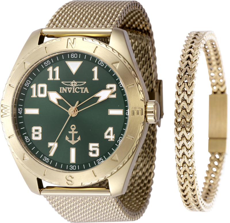 Band Material: Stainless Steel, Band Tone: Gold, Band Width: 22MM, Band Length: 205MM, Crown Type: Push, Case Material: Stainless Steel, Case Tone: Gold, Case Size [mm]: 45, Color of Hands: Luminous, Gold, Crystal Type: Mineral, Bezel Material: None, Dial Material: Brass, Dial Color: Green .Purchasing these parts and having a non-authorized repair center open your watch voids all manufacturing warranties. Invicta cannot guarantee the quality standards of an altered timepiece, the standard 3-year limited warranty on Invicta timepieces shall be invalid if the timepiece is serviced at any time by an unauthorized repair center. This includes battery replacements, which must be done at an Invicta authorized repair center in order to maintain the eligibility of the warranty. Please follow the link below to learn more about Invicta's warranty.https://cdn.invictawatch.com/www/files/invicta-warranty-2018.pdf