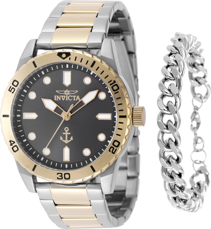 Band Material: Stainless Steel, Band Tone: Gold, Steel, Band Width: 22MM, Band Length: 186MM, Crown Type: Push, Case Material: Stainless Steel, Case Tone: Steel, Gold, Case Size [mm]: 43, Color of Hands: Luminous, Gold, Crystal Type: Mineral, Bezel Material: None, Dial Material: Brass, Dial Color: Grey .Purchasing these parts and having a non-authorized repair center open your watch voids all manufacturing warranties. Invicta cannot guarantee the quality standards of an altered timepiece, the standard 3-year limited warranty on Invicta timepieces shall be invalid if the timepiece is serviced at any time by an unauthorized repair center. This includes battery replacements, which must be done at an Invicta authorized repair center in order to maintain the eligibility of the warranty. Please follow the link below to learn more about Invicta's warranty.https://cdn.invictawatch.com/www/files/invicta-warranty-2018.pdf