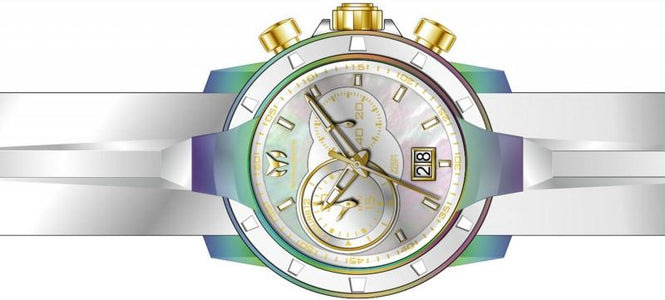 , Crown Type Screw Down, Case Material Stainless Steel, Case Tone Iridescent, Case Size (mm) 45, Case Back Solid, Material of Hands Metal, Color of Hands Gold, Crystal Type Sapphire, Bezel Material Stainless Steel, Dial Material Mother of Pearl, Dial Color White, Dial Pattern None