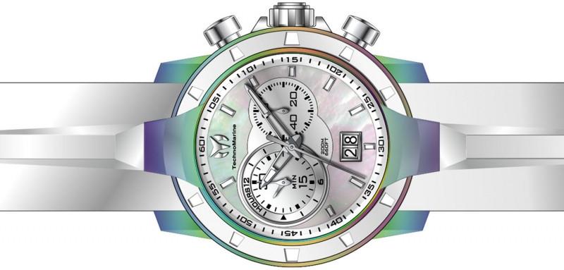 , Crown Type Screw Down, Case Material Stainless Steel, Case Tone Iridescent, Case Size (mm) 45, Case Back Solid, Material of Hands Metal, Color of Hands Silver, Crystal Type Sapphire, Bezel Material Stainless Steel, Dial Material Mother of Pearl, Dial Color White, Dial Pattern None