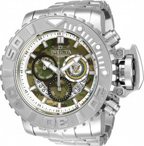 Band Material: Stainless Steel, Band Tone: Steel, Band Width: 30MM, Band Length: 225MM, Crown Type: Push, Case Material: Stainless Steel, Case Tone: Steel, Case Size [mm]: 58, Color of Hands: Silver, Luminous, Crystal Type: Flame Fusion, Bezel Material: Stainless Steel, Dial Material: Metal, Dial Color: Camouflage .Purchasing these parts and having a non-authorized repair center open your watch voids all manufacturing warranties. Invicta cannot guarantee the quality standards of an altered timepiece, the standard 3-year limited warranty on Invicta timepieces shall be invalid if the timepiece is serviced at any time by an unauthorized repair center. This includes battery replacements, which must be done at an Invicta authorized repair center in order to maintain the eligibility of the warranty. Please follow the link below to learn more about Invicta's warranty.https://cdn.invictawatch.com/www/files/invicta-warranty-2018.pdf